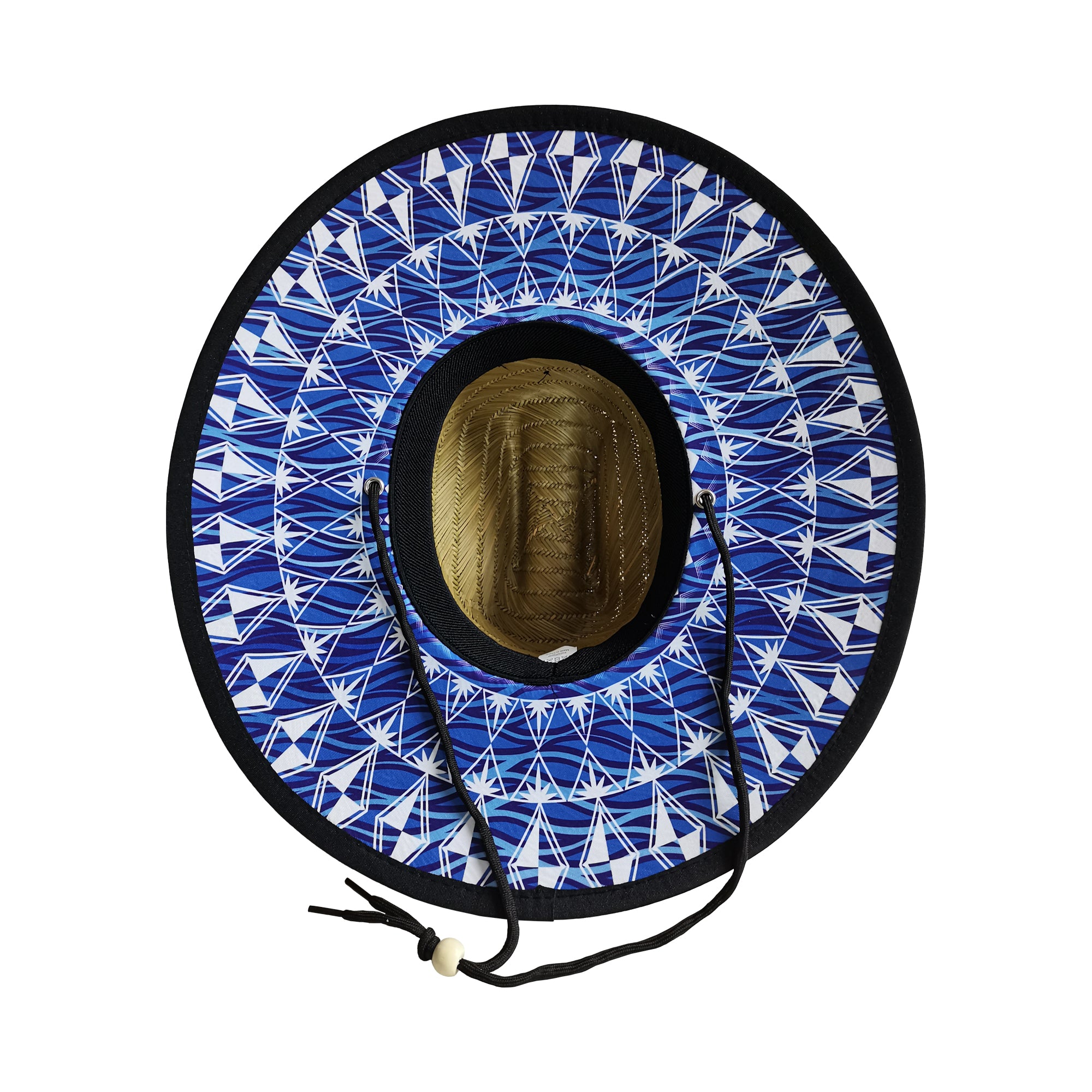 Découvrez le chapeau en paille naturelle Clipperton, orné de motifs traditionnels polynésiens sur un fond bleu vous r...